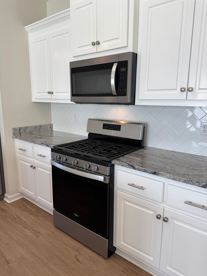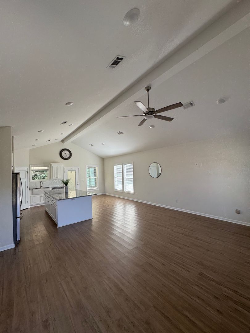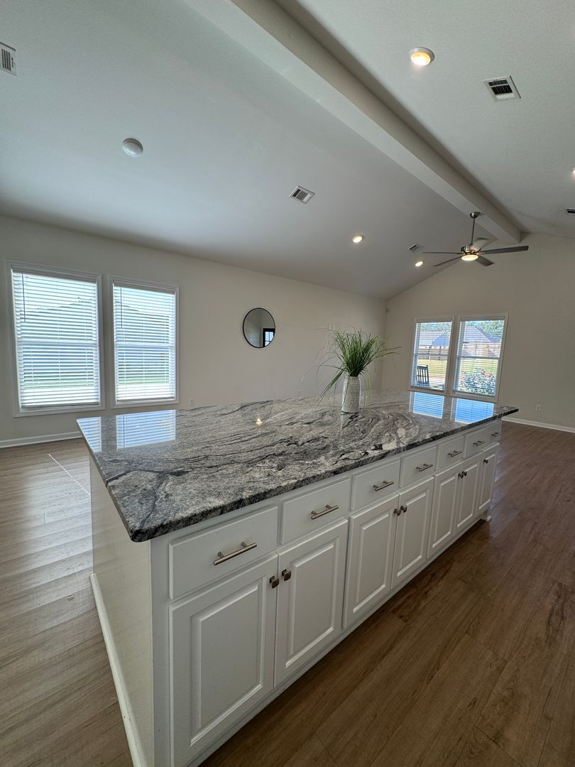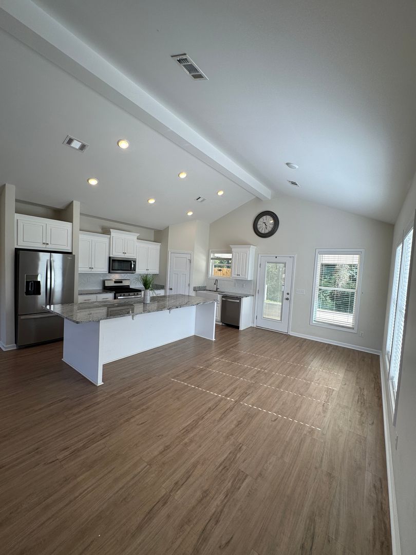 Step inside to find a bright, open-concept living space with vaulted ceilings and sleek vinyl plank flooring throughout — no carpet to worry about! The spacious kitchen is a chef’s dream, featuring granite countertops, stainless steel appliances, and an oversized island that’s perfect for meal prep or casual dining. The open layout connects seamlessly to the living and dining areas, making it easy to entertain friends or relax with family.